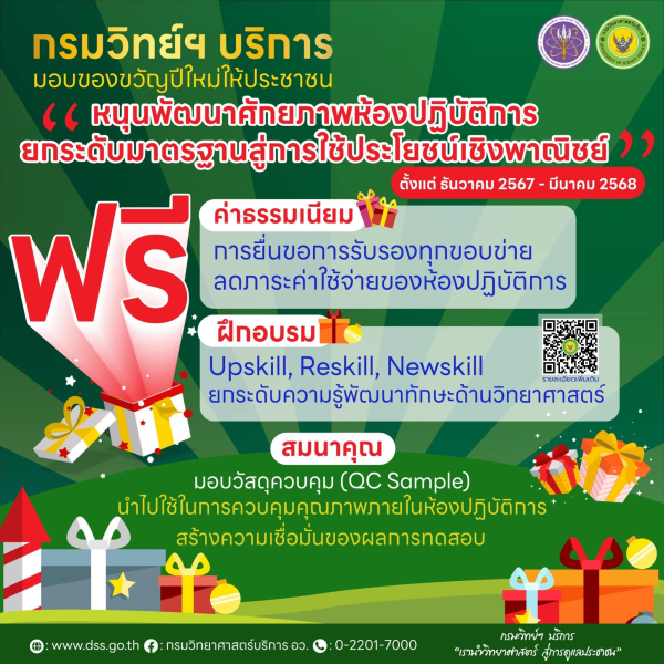 กรมวิทย์ฯ บริการ กระทรวง อว. มอบของขวัญปีใหม่ประชาชน 2568 ..ฟรี !! Upskill, Reskill, Newskill ผ่านระบบออนไลน์กว่า 43 หลักสูตร!! เสริมทักษะด้าน วทน. พร้อมยกเว้นค่าธรรมเนียมยื่นขอการรับรอง ทุกขอบข่าย และสมนาคุณ QC Sample ควบคุมคุณภาพห้องปฏิบัติการ ไทยสู่สากล