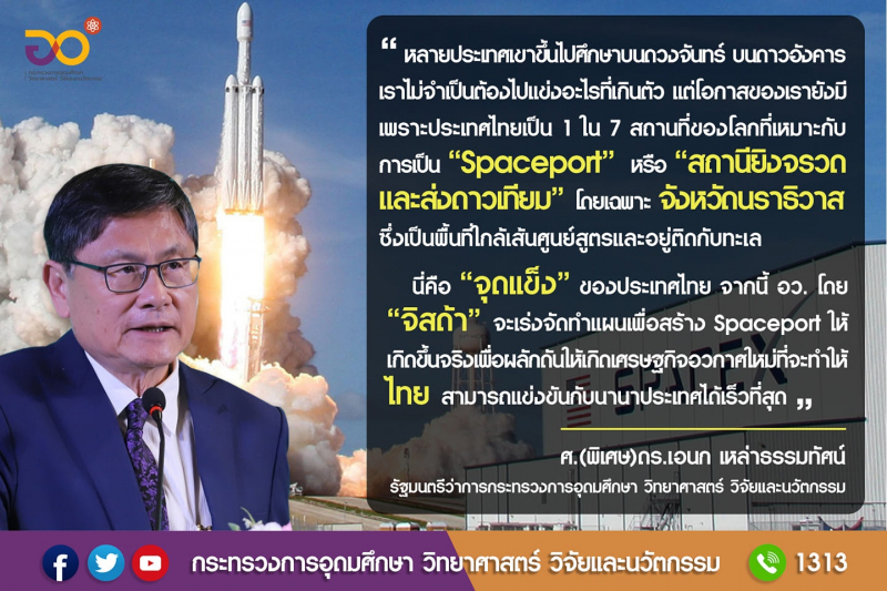 "หลายประเทศเขาขึ้นไปศึกษาบนดวงจันทร์ บนดาวอังคาร เราไม่จำเป็นต้องไปแข่งอะไรที่เกินตัว แต่โอกาสของเรายังมี เพราะประเทศไทย เป็น 1 ใน 7 สถานที่ของโลกที่เหมาะกับการเป็น "spaceport" หรือ "สถานียิงจรวดและส่งดาวเทียม" โดยเฉพาะจังหวัดนราธิวาส ซึ่งเป็นพื้นที่ใกล้เส้นศูนย์สูตรและอยู่ติดกับทะเล นี่คือจุดแข็งของประเทศไทย จากนี้ อว. โดย จิสด้า จะเร่งจัดทำแผนเพื่อสร้าง spaceport ให้เกิดขึ้นจริง เพื่อผลักดันให้เกิดเศรษฐกิจอวกาศใหม่ที่จะทำให้ไทยสามารถแข่งขันกับนานาประเทศได้เร็วที่สุด"
