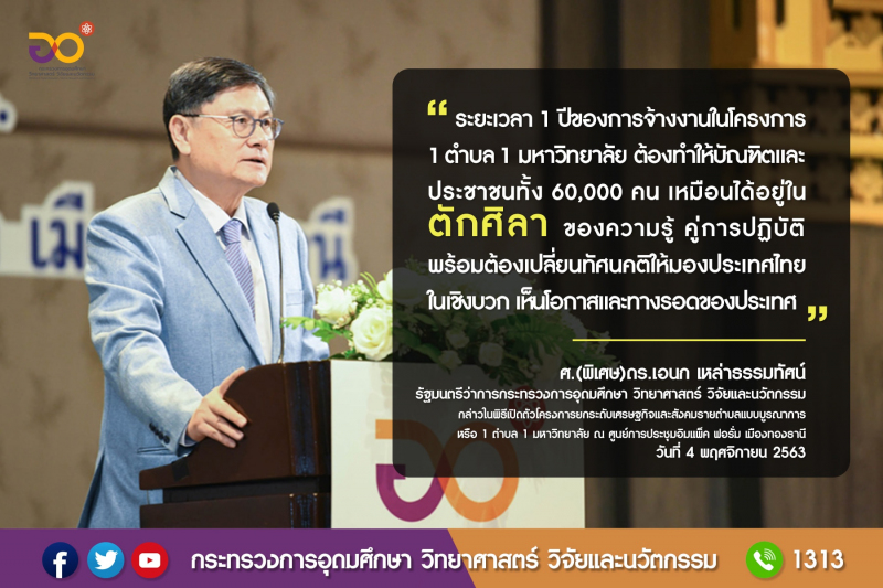 ระยะเวลา 1 ปี ของการจ้างงานในโครงการ 1 ตำบล 1 มหาวิทยาลัย ต้องทำให้บัณฑิตและประชาชนทั้ง 60,000 คน เหมือนได้อยู่ในตักศิลาของความรู้ คู่การปฏิบัติพร้อมต้องเปลี่ยนทัศนคติให้มองประเทศไทยในเชิงบวก เห็นโอกาสและทางรอดของประเทศ
