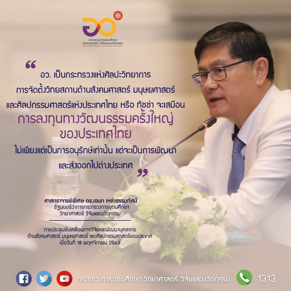 "อว. เป็นกระทรวงแห่งศิลปะวิทยาการ การจัดตั้งวิทยสถานด้านสังคมศาสตร์ มนุษยศาสตร์และศิลปกรรมศาสตร์แห่งประเทศไทยหรือ ทัชช่า จะเสมือนการลงทุนทางวัฒนธรรมครั้งใหญ่ของประเทศไทย ไม่เพียงแต่เป็นการอนุรักษ์เท่านั้น แต่จะเป็นการพัฒนาและส่งออกไปต่างประเทศ"