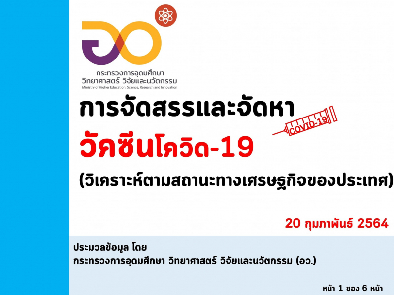 (20 กุมภาพันธ์ 2564) ศาสตราจารย์ ดร. นายแพทย์สิริฤกษ์ ทรงศิวิไล ปลัดกระทรวงการอุดมศึกษา วิทยาศาสตร์ วิจัยและนวัตกรรม (อว.) รายงานสถานการณ์การจัดหาวัคซีนโควิด-19 โดยการวิเคราะห์ตามสถานะทางเศรษฐกิจของประเทศต่างๆทั่วโลก พบว่า "มีความไม่เท่าเทียมกันชัดเจน โดยยอดการจองวัคซีนมากกว่า 50% อยู่ในกลุ่มประเทศรายได้สูงซึ่งมีจำนวนคนเพียง 16% ของประชากรทั่วโลกเท่านั้น แต่จองวัคซีนแล้วมากกว่าจำนวนประชากร" ในขณะเดียวกันผลการใช้วัคซีนจำนวนเกือบ 200 ล้านโดสซึ่งได้ผลดีและปลอดภัย จะทำให้เกิดการเปลี่ยนแปลงโดยการกระจายวัคซีนส่วนเกินไปยังประเทศอื่นๆมากขึ้น