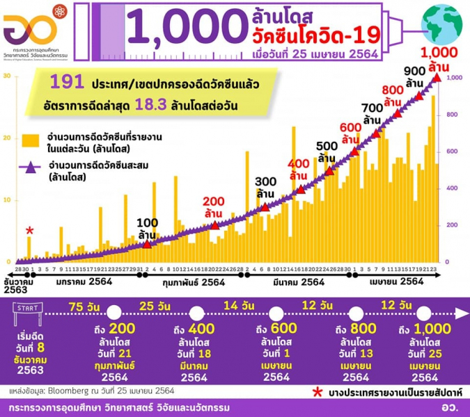 เมื่อ 25 เมษายน 2564 ศาสตราจารย์ ดร. นายแพทย์สิริฤกษ์ ทรงศิวิไล ปลัดกระทรวงการอุดมศึกษา วิทยาศาสตร์ วิจัยและนวัตกรรม (อว.) เผยว่า "ขณะนี้ได้มีการฉีดวัคซีนโควิด-19 ทั่วโลก แล้วถึงระดับ 1,000 ล้านโดส ใน 191 ประเทศ/เขตปกครอง ใช้เวลาเพียง 138 วัน เร็วที่สุดในประวัติศาสตร์ โดยความเร็วในการฉีดรวดเร็วเพิ่มขึ้นอย่างต่อเนื่อง ซึ่ง 500 ล้านโดสแรกใช้เวลา 108 วัน ในขณะที่ 500 ล้านโดสหลัง ใช้เวลาเร็วขึ้น 3 เท่า เพียง 30 วันเท่านั้น”