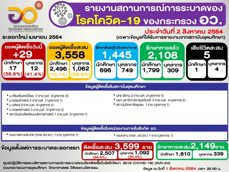 ข้อมูล : ศูนย์ปฏิบัติการและบริหารสถานการณ์การระบาดของโรคติดเชื้อไวรัสโคโรนา 2019 (COVID-19) (ศปก.อว.)