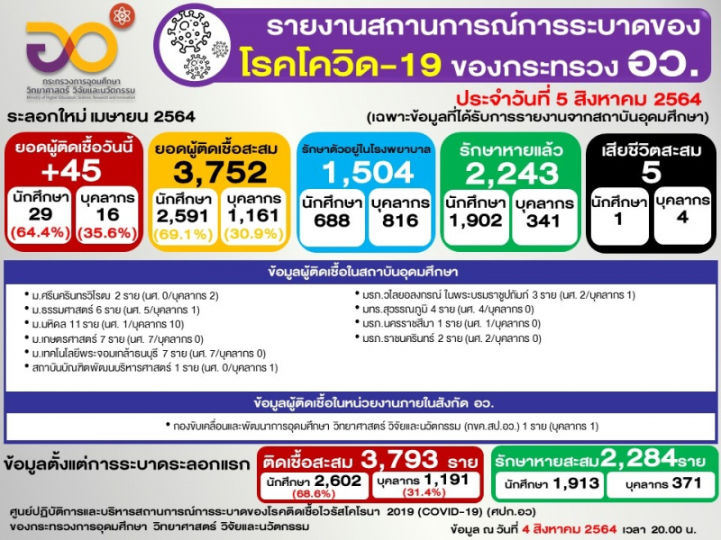 ข้อมูล : ศูนย์ปฏิบัติการและบริหารสถานการณ์การระบาดของโรคติดเชื้อไวรัสโคโรนา 2019 (COVID-19) (ศปก.อว.)