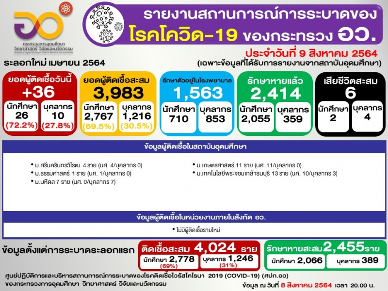 ข้อมูล : ศูนย์ปฏิบัติการและบริหารสถานการณ์การระบาดของโรคติดเชื้อไวรัสโคโรนา 2019 (COVID-19) (ศปก.อว.)