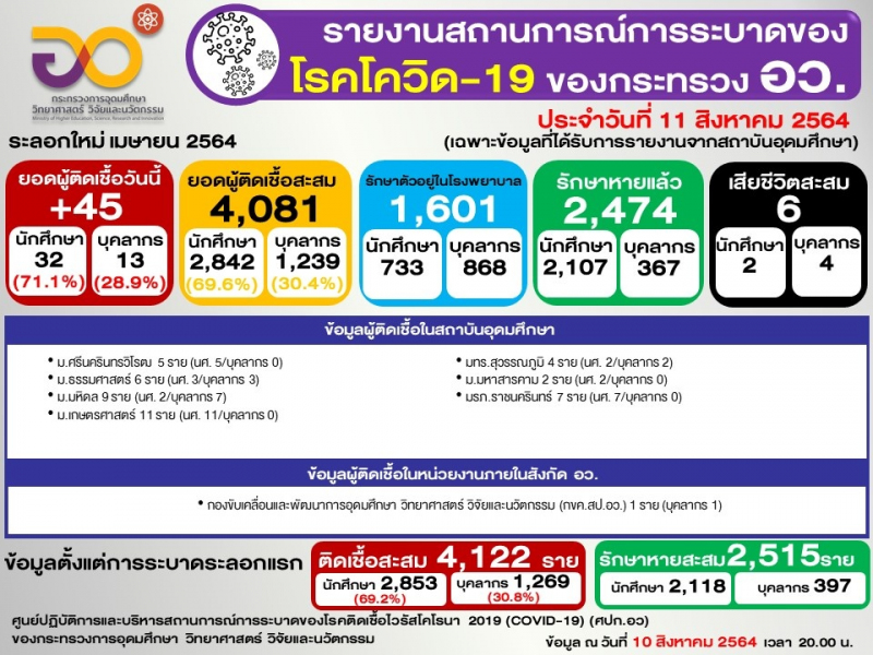 ข้อมูล : ศูนย์ปฏิบัติการและบริหารสถานการณ์การระบาดของโรคติดเชื้อไวรัสโคโรนา 2019 (COVID-19) (ศปก.อว.)