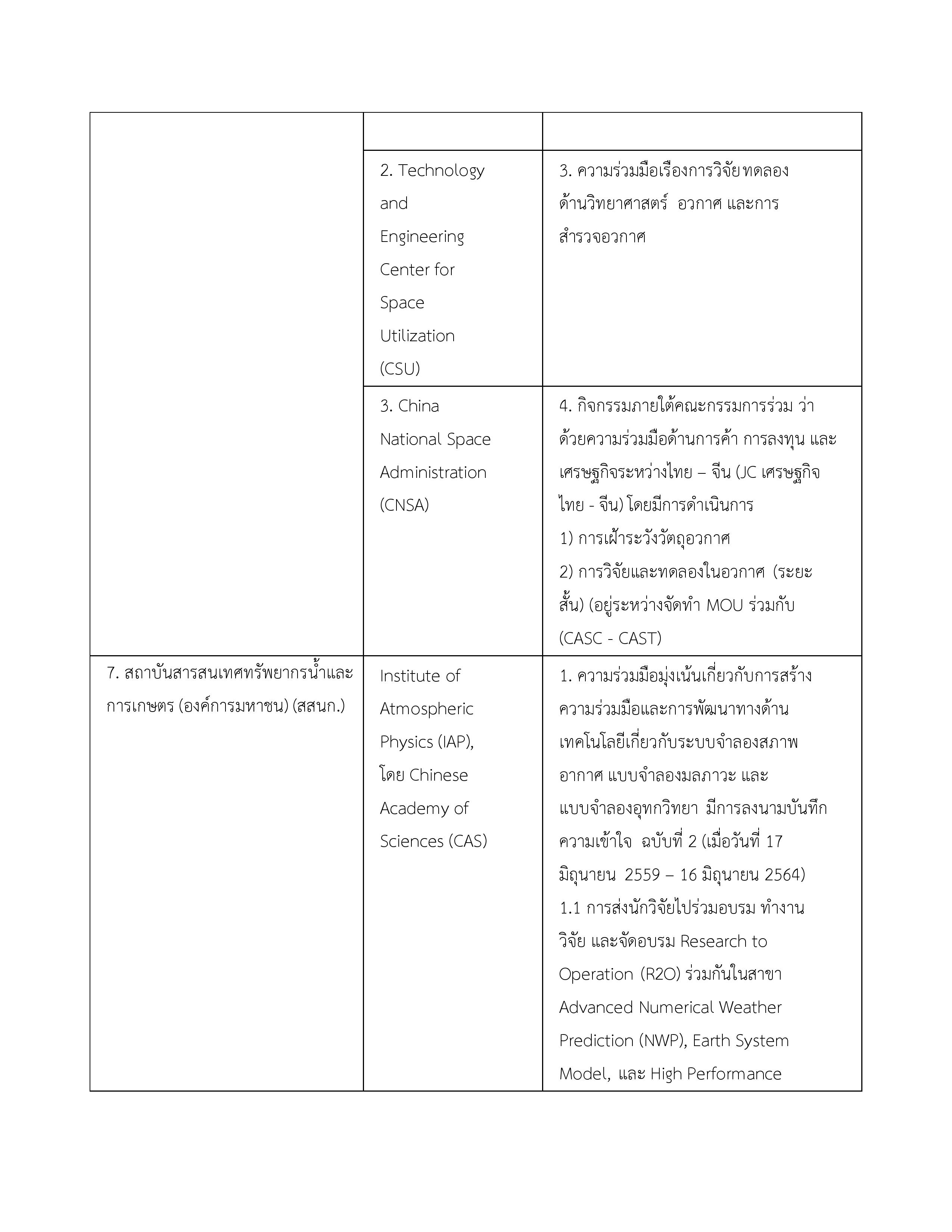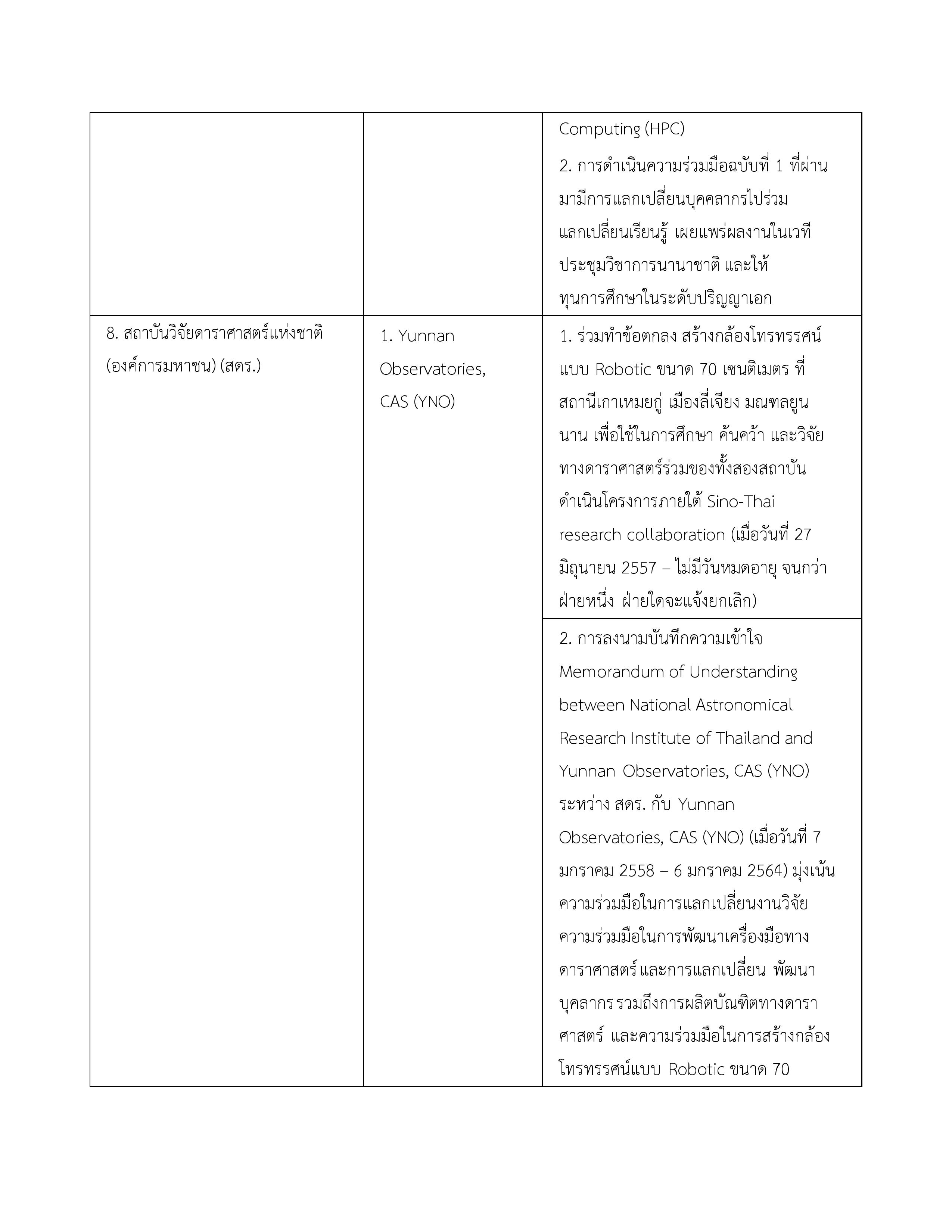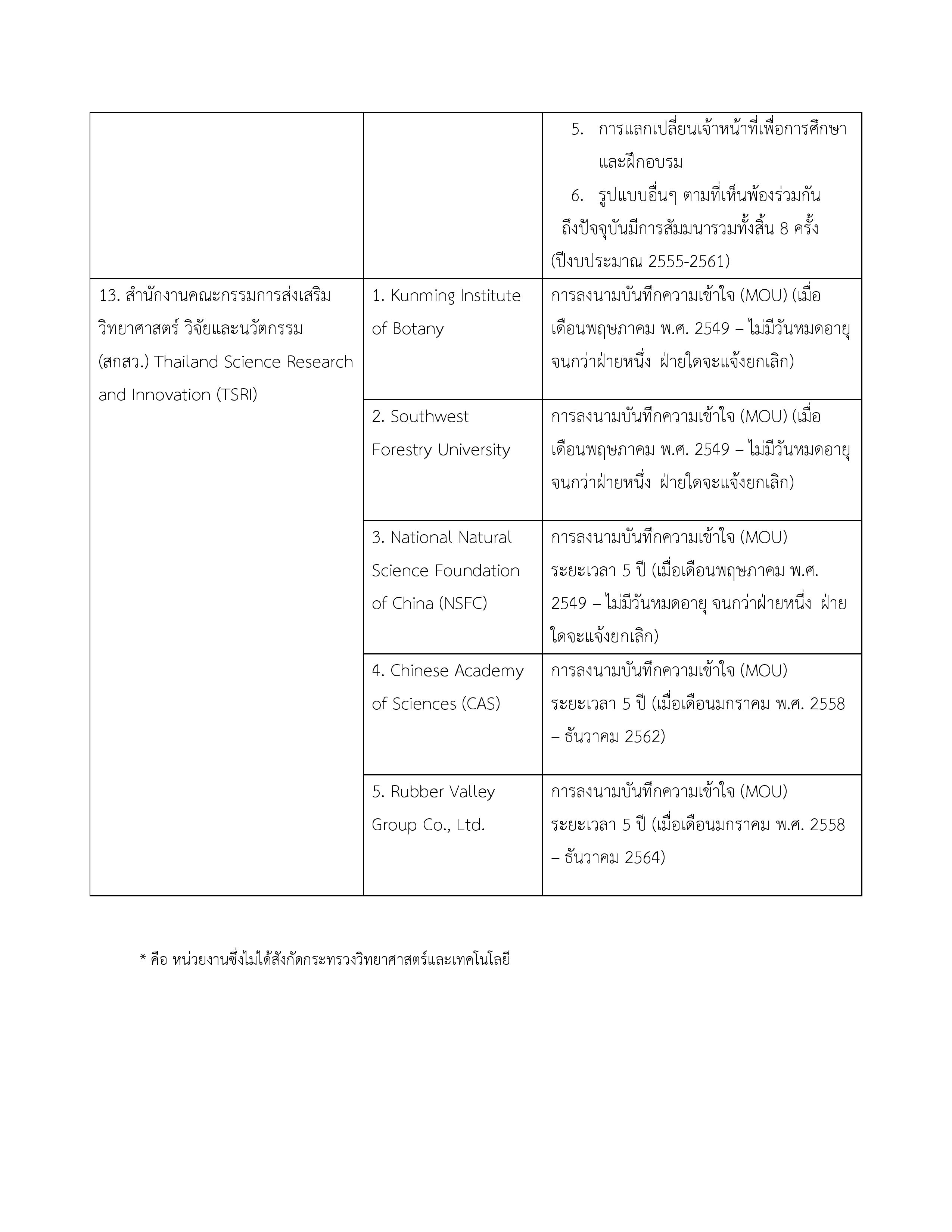 | 5. บันทึกข้อตกลงความร่วมมือด้านการส่งเสริมวิทยาศาสตร์และเทคโนโลยี ระหว่างกระทรวงการอุดมศึกษา วิทยาศาสตร์ วิจัย และนวัตกรรม และทรวงวิทยาศาสตร์และเทคโนโลยี สาธารณรัฐประชาชนจีน | 5 พฤศจิกายน 2562 | 4 พฤศจิกายน 2567 |