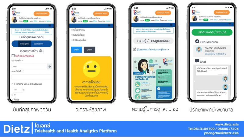 จากกสถานการณ์การระบาดของเชื้อไวรัสโควิด-19 ที่ยังคงทวีความรุนแรงอย่างต่อเนื่อง NIA จึงขอเป็นส่วนหนึ่งในการส่งเสริมและสนับสนุนนวัตกรรมที่เข้ามาช่วยบรรเทาปัญหาและผลกระทบที่เกิดขึ้น โดยได้ให้การสนับสนุน "ระบบ การแพทย์ทางไกลและระบบรายงานอาการผู้ป่วยโควิด 19" ภายใต้โครงการนวัตกรรมแบบมุ่งเป้าเพื่อรับมือการแพร่ระบาดโควิด-19 ให้แก่บริษัท พรีซีชั่น ไดเอทซ์ จำกัด ภายใต้ความร่วมมือของสมาคมเฮลเทคไทย เพื่อเพิ่มประสิทธิภาพการให้บริการผู้ป่วย และลดความเสี่ยงในการติดเชื้อ และลดภาระงานให้กับบุคลากรทางการแพทย์ ซึ่งระบบดังกล่าวขณะนี้ได้นำไปใช้จริงแล้วใน ASQ ของ รพ. เอกชนขนาดใหญ่หลายแห่ง