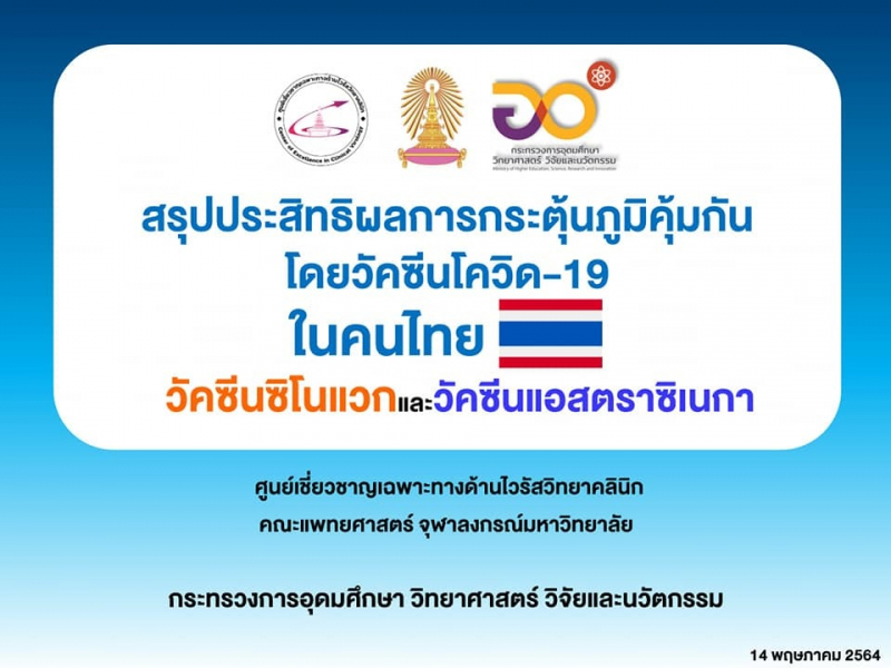 (เมื่อวันที่14 พฤษภาคม 2564) ศาสตราจารย์ ดร. นายแพทย์สิริฤกษ์ ทรงศิวิไล ปลัดกระทรวงการอุดมศึกษา วิทยาศาสตร์ วิจัยและนวัตกรรม (อว.) เปิดเผยผลการศึกษาประสิทธิผลการกระตุ้นภูมิคุ้มกันของวัคซีนโรคโควิด-19 ทั้งสองชนิดที่ฉีดในคนไทย ของศูนย์เชี่ยวชาญเฉพาะทางด้านไวรัสวิทยาคลินิก คณะแพทยศาสตร์ จุฬาลงกรณ์มหาวิทยาลัย ว่า "ทั้งวัคซีนของซิโนแวก และวัคซีนของแอสตราซิเนกา สามารถกระตุ้นภูมิคุ้มกันได้ดีมาก ผู้ได้รับวัคซีนเกือบทุกรายสามารถสร้างแอนติบอดีในระดับสูง โดย 97.26% ของผู้ที่ฉีดวัคซีนแอสตราซิเนกาเข็มแรกแล้ว 4 สัปดาห์ และ 99.49% ของผู้ที่ฉีดวัคซีนซิโนแวกสองเข็มแล้ว 4 สัปดาห์ สามารถสร้างแอนติบอดีต่อเชื้อไวรัสโควิด-19 ได้"
