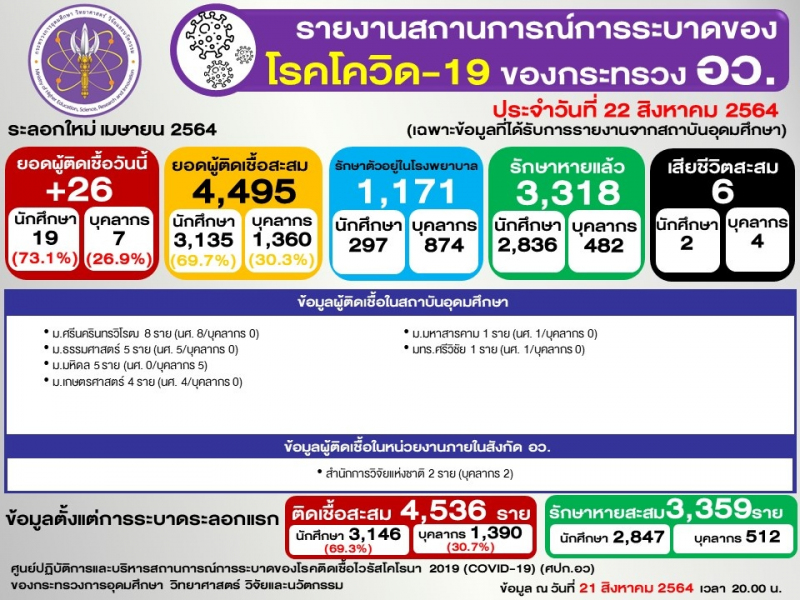 ข้อมูล : ศูนย์ปฏิบัติการและบริหารสถานการณ์การระบาดของโรคติดเชื้อไวรัสโคโรนา 2019 (COVID-19) (ศปก.อว.)