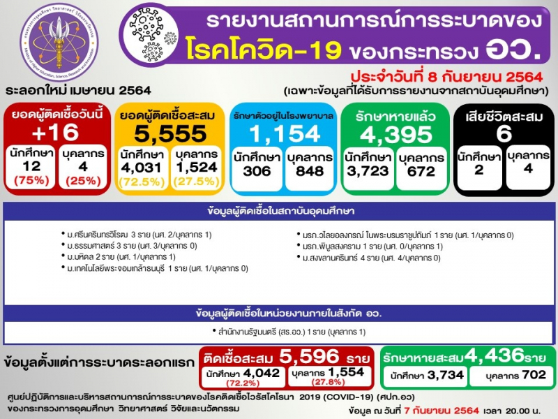 ข้อมูล : ศูนย์ปฏิบัติการและบริหารสถานการณ์การระบาดของโรคติดเชื้อไวรัสโคโรนา 2019 (COVID-19) (ศปก.อว.)
