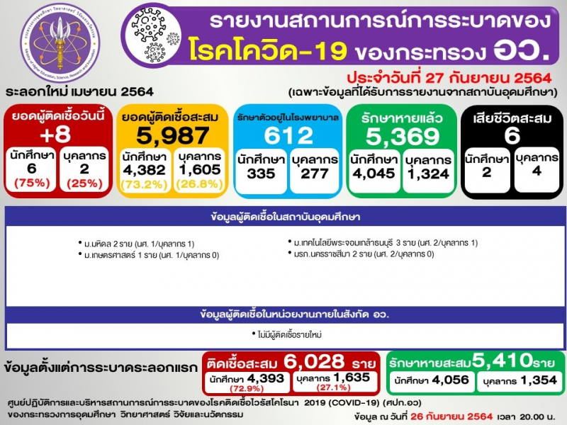 ข้อมูล : ศูนย์ปฏิบัติการและบริหารสถานการณ์การระบาดของโรคติดเชื้อไวรัสโคโรนา 2019 (COVID-19) (ศปก.อว.)