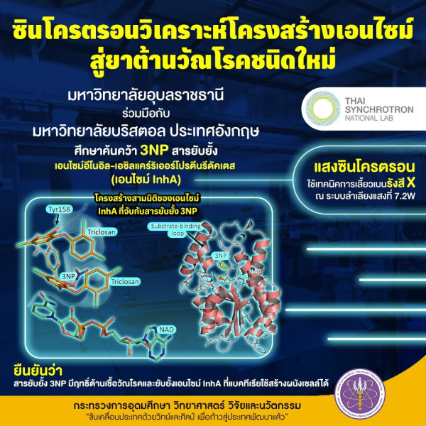 ?นักวิทยาศาสตร์จากสถาบันวิจัยแสงซินโครตรอน (องค์การมหาชน) กระทรวงการอุดมศึกษา วิทยาศาสตร์ เทคโนโลยี และนวัตกรรม (อว.) ร่วมมือนักวิจัยมหาวิทยาลัยอุบลราชธานีพิสูจน์ฤทธิ์ต้านเชื้อวัณโรคของสารออกฤทธิ์ชีวภาพ โดยใช้แสงซินโครตรอนวิเคราะห์คุณสมบัติการออกฤทธิ์ยับยั้งเอนไซม์สำคัญของแบคทีเรียที่เป็นสาเหตุของโรค