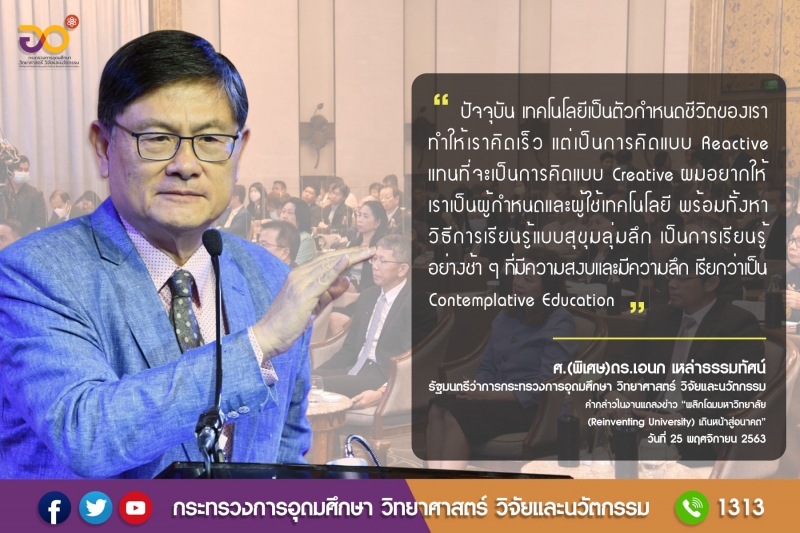 "ปัจจุบัน เทคโนโลยีเป็นตัวกำหนดชีวิตของเรา ทำให้เราคิดเร็ว แต่เป็นการคิดแบบ Reactive แทนที่จะเป็นการคิดแบบ Creative ผมอยากให้เราเป็นผู้กำหนดและผู้ใช้เทคโนโลยี พร้อมทั้งหาวิธีการเรียนรู้แบบสุขุมลุ่มลึก เป็นการเรียนรู้อย่างช้าๆ ที่มีความสงบและมีความลึก เรียกว่าเป็น Contemplative Education"