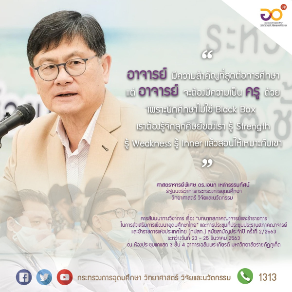 "อาจารย์ มีความสำคัญที่สุดต่อการศึกษา แต่อาจารย์จะต้องมีความเป็นครูด้วย เพราะนักศึกษาไม่ใช่ Black Box เราต้องรู้จักลูกศิษย์ของเรา รู้ Strength รู้ Weakness รู้ Inner แล้วสอนให้เหมาะกับเขา"