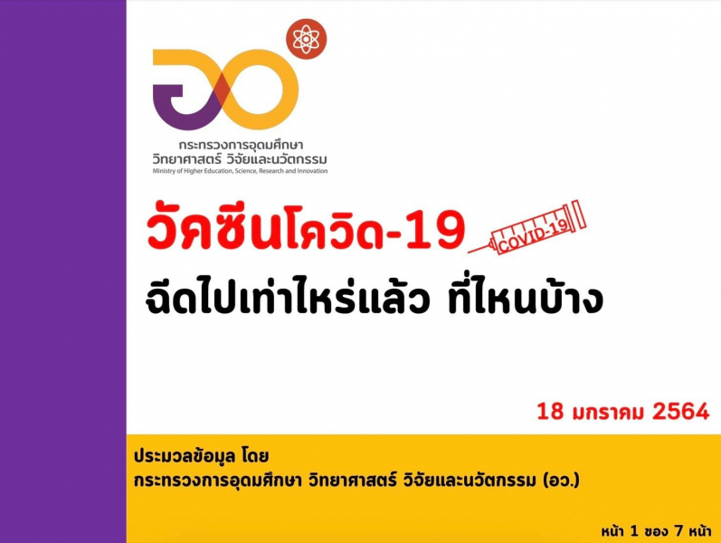 (18 มกราคม 2564) ศาสตราจารย์ ดร. นายแพทย์สิริฤกษ์ ทรงศิวิไล ปลัดกระทรวงการอุดมศึกษา วิทยาศาสตร์ วิจัยและนวัตกรรม (อว.) รายงานผลการประมวลข้อมูลเกี่ยวกับการใช้วัคซีนโควิด-19 ว่า “ขณะนี้ได้มีการฉีดวัคซีนไปแล้ว 42.2 ล้านโดส ใน 51 ประเทศทั่วโลก เพิ่มขึ้นวันละ 2.43 ล้าน คนอเมริกันได้รับแล้วมากที่สุด 14.3 ล้านโดส ในขณะที่คนอิสราเอลหนึ่งในสี่คนฉีดวัคซีนแล้ว"