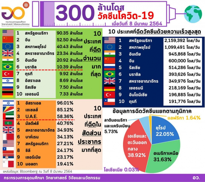 "อว. รายงานวันนี้ฉีดวัคซีนโควิด-19 รวม 300 ล้านโดสใน 114 ประเทศ ส่วนในอาเซียนฉีดแล้ว 8 ประเทศ เวียตนามเริ่มฉีดวัคซีนวันนี้"