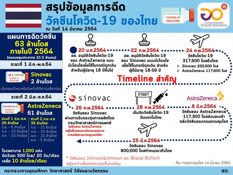 (14 มีนาคม 2564) ศาสตราจารย์ ดร. นายแพทย์สิริฤกษ์ ทรงศิวิไล ปลัดกระทรวงการอุดมศึกษา วิทยาศาสตร์ วิจัยและนวัตกรรม (อว.) รายงานว่า กระทรวง อว. ได้ร่วมกับกระทรวงสาธารณสุข ติดตามและประมวลผลการฉีดวัคซีนโควิด-19 ในคนไทยหลังฉีดแล้ว 2 สัปดาห์ โดยสรุปว่า "ขณะนี้ประเทศไทยได้ฉีดวัคซีนโควิด-19 แล้ว จำนวน 44,963 คน ใน 13 จังหวัด ทั้งหมดเป็นวัคซีนของซิโนแวคตามแผนระยะที่ 1