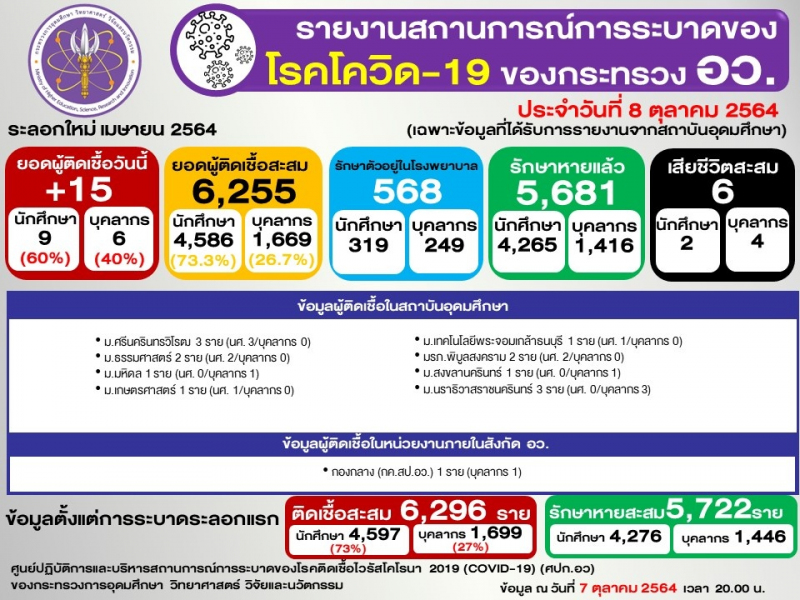 ข้อมูล : ศูนย์ปฏิบัติการและบริหารสถานการณ์การระบาดของโรคติดเชื้อไวรัสโคโรนา 2019 (COVID-19) (ศปก.อว.)