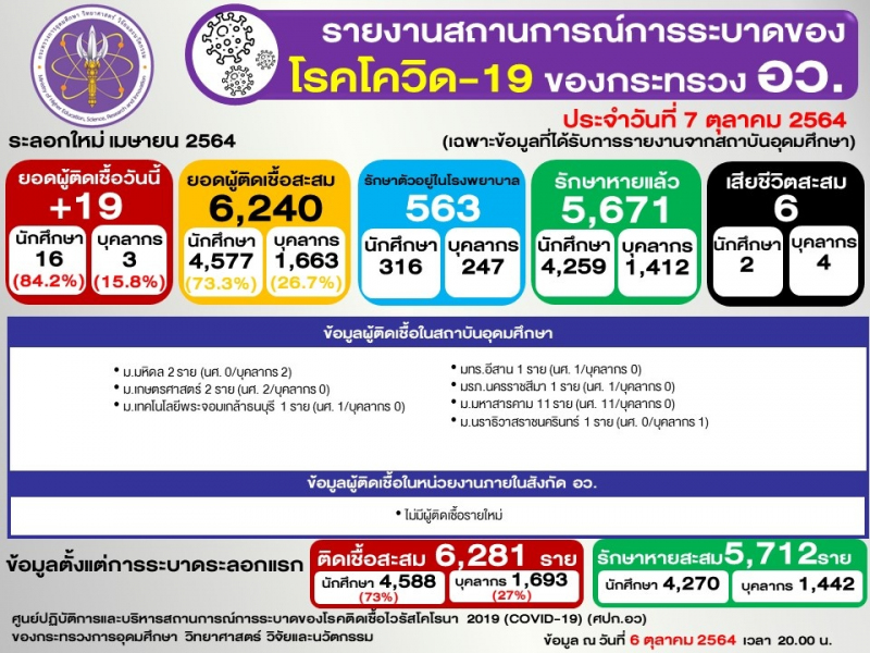 ข้อมูล : ศูนย์ปฏิบัติการและบริหารสถานการณ์การระบาดของโรคติดเชื้อไวรัสโคโรนา 2019 (COVID-19) (ศปก.อว.)