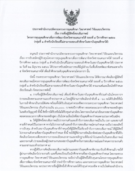 ประกาศรายชื่อผู้มีสิทธิ์สอบสัมภาษณ์โครงการทุนอุดมศึกษาเพื่อการพัฒนาจังหวัดชายแดนภาคใต้ ระยะที่ 4 ปีการศึกษา 2566 (กลุ่มที่ 1)
