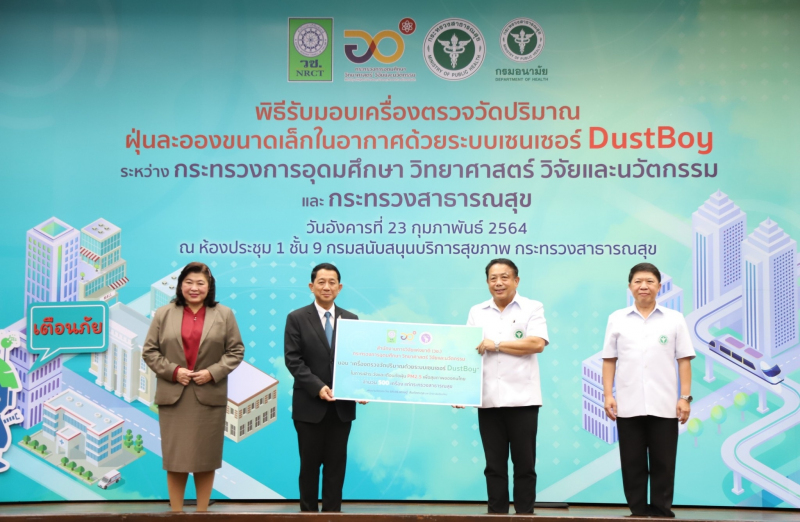ดร.วิภารัตน์ ดีอ่อง ผู้อำนวยการ วช. พร้อมด้วย นพ.สุวรรณชัย วัฒนายิ่งเจริญชัย อธิบดีกรมอนามัย และ รศ.ดร.เศรษฐ์ สัมภัตตะกุล มหาวิทยาลัยเชียงใหม่ หัวหน้าโครงการวิจัย “การเฝ้าระวังและติดตามคุณภาพอากาศด้วยเครื่องวัดฝุ่นละอองขนาดเล็ก PM2.5 และ PM10 แบบเซนเซอร์ (DustBoy)” ได้ร่วมส่งมอบนวัตกรรม “เครื่องตรวจวัดฝุ่น DustBoy” ให้แก่ กรมอนามัย โรงพยาบาลส่งเสริมสุขภาพตำบล และหน่วยงานที่เกี่ยวข้อง จำนวน 500 เครื่อง ในการเฝ้าระวัง เตือนภัยสถานการณ์ฝุ่น PM2.5 เพื่อสุขภาพของประชาชน