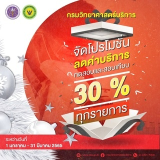 กรมวิทยาศาสตร์บริการ (วศ.) กระทรวงการอุดมศึกษา วิทยาศาสตร์ วิจัยและนวัตกรรม (อว.) มอบของขวัญปีใหม่ 2565 ให้ประชาชน โดยลดค่าบริการทดสอบและสอบเทียบแบบปกติ 30% ทุกรายการ นาน 3 เดือน เริ่มตั้งแต่วันที่ 1 มกราคม - 31 มีนาคม 2565 เพื่อสนับสนุนบริการทางวิทยาศาสตร์มอบให้ผู้รับบริการในภาคอุตสาหกรรม วิสาหกิจขนาดกลางและขนาดย่อม (SMEs) และประชาชนทั่วไป โดยเป็นกิจกรรมของขวัญสำหรับประชาชนในปีใหม่สอดคล้องตามนโยบายของ พล.อ.ประยุทธ์ จันทร์โอชา นายกรัฐมนตรี