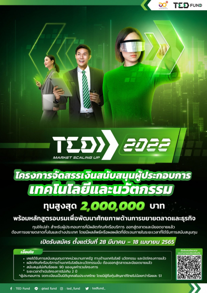 กองทุนพัฒนาผู้ประกอบการเทคโนโลยีและนวัตกรรม (TED Fund) ขอเชิญชวน ชาว SMEs และ Startup ที่มีผลิตภัณฑ์หรือบริการ ออกสู่ตลาด มียอดขายแล้ว และต้องการขยายตลาดทั้งในและต่างประเทศ โดยมีผลลัพธ์หรือผลผลิตที่ชัดเจน ภายในระยะเวลาที่ได้รับการสนับสนุนทุน มาสมัครเข้าร่วมโครงการจัดสรรเงินสนับสนุนผู้ประกอบการเทคโนโลยีและนวัตกรรม ภายใต้ TED Market Scaling Up 2022 โดยมีทุนสูงสุด 2,000,000 บาท และกิจกรรมอบรมเพื่อพัฒนาศักยภาพด้านการขยายตลาดและธุรกิจ เพื่อให้ชาว SMEs และ Startup สามารถขยายธุรกิจของตัวเองให้เติบโตอย่างก้าวกระโดดและต่อเนื่อง