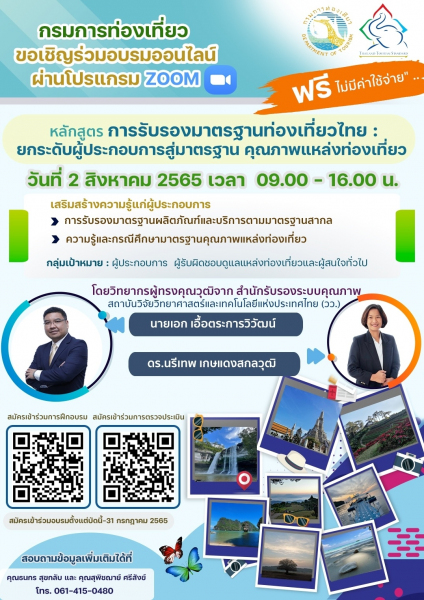 กระทรวงการอุดมศึกษา วิทยาศาสตร์ วิจัยและนวัตกรรม (อว.) สถาบันวิจัยวิทยาศาสตร์และเทคโนโลยีแห่งประเทศไทย (วว.) โดย สำนักรับรองระบบคุณภาพ (สรร.) ร่วมกับ กรมการท่องเที่ยว กระทรวงการท่องเที่ยวและกีฬา จัดการอบรมออนไลน์ ฟรี! หลักสูตร “การรับรองมาตรฐานท่องเที่ยวไทย : ยกระดับผู้ประกอบการสู่มาตรฐาน คุณภาพแหล่งท่องเที่ยว” ในวันที่ 2 สิงหาคม 2565 เวลา 09.00-16.00 น. ผ่านโปรแกรม ZOOM เพื่อเสริมสร้างความรู้แก่ผู้ประกอบการ ผู้รับผิดชอบดูแลแหล่งท่องเที่ยวและผู้สนใจทั่วไป ในหลักสูตรการรับรองมาตรฐานผลิตภัณฑ์และบริการตามมาตรฐานสากล หลักสูตรความรู้และกรณีศึกษามาตรฐานคุณภาพแหล่งท่องเที่ยว ถ่ายทอดความรู้โดยวิทยากรผู้ทรงคุณวุฒิจาก สรร. วว. ได้แก่ นายเอก เอื้อตระการวิวัมน์ และดร.นรีเทพ เกษแดงสกุลวุฒิ สมัครเข้าร่วมอบรมได้ตั้งแต่บัดนี้ถึงวันที่ 31 กรกฎาคม 2565 สอบถามรายละเอียดเพิ่มเติม ได้ที่ สำนักรับรองระบบคุณภาพ วว. (คุณธนากร สุขกลับ/ คุณสุพิชฌาย์ ศรีสังข์) โทร. 061 415 0480