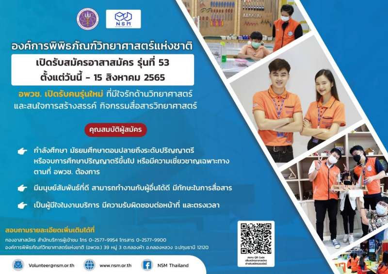 อพวช. เปิดรับอาสาสมัครอาสาสมัคร รุ่นที่ 53 ให้นิสิต นักศึกษา และผู้ที่สนใจสามารถเข้าร่วมปฏิบัติงานในส่วนงานต่างๆ