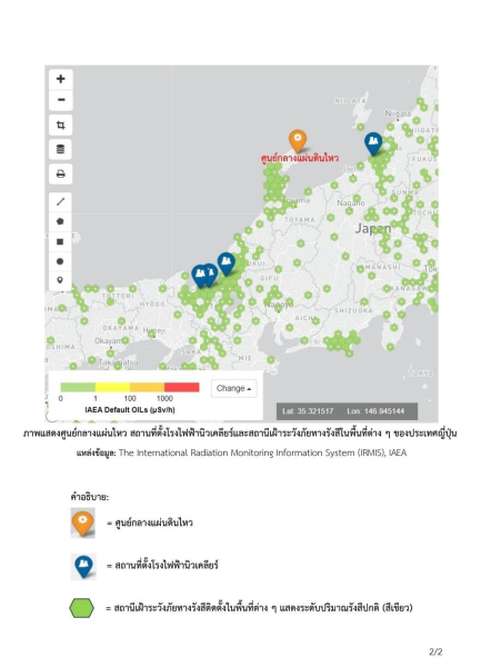 สำนักงานปรมาณูเพื่อสันติ (ปส.) ในฐานะประเทศภาคีภายใต้อนุสัญญาการแจ้งเหตุทางนิวเคลียร์โดยเร็ว (Convention on Early Notification of a Nuclear Accident) ทบวงการพลังงานปรมาณูระหว่างประเทศ (International Atomic Energy Agency, IAEA) ได้รับรายงานจากหน่วยงานกำกับดูแลความปลอดภัยทางนิวเคลียร์ประเทศญี่ปุ่น (Nuclear Regulation Authority, NRA) ว่า มีโรงไฟฟ้านิวเคลียร์ที่อยู่ใกล้จุดศูนย์กลางของแผ่นดินไหว จำนวน 6 แห่ง คือ