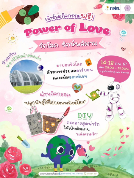 กระทรวงการอุดมศึกษา วิทยาศาสตร์ วิจัยและนวัตกรรม (อว.)  สถาบันวิจัยวิทยาศาสตร์และเทคโนโลยีแห่งประเทศไทย (วว.)  โดย สถานีวิจัยลำตะคอง จังหวัดนครราชสีมา  ร่วมกับ ศูนย์การเรียนรู้ กฟผ. ลำตะคอง จัดกิจกรรมเทศกาลเแห่งความรัก Power  of  Love “รักโลก รักษ์พลังงาน” เพื่อช่วยลดคาร์บอน ปลดปล่อยออกซิเจน และลดมลพิษในอากาศ ผ่านกิจกรรม DIY ฟรี! ปลูกพันธุ์ไม้ใส่กระถาง เพื่อเป็นของขวัญให้กับตัวเอง เพื่อน ครอบครัว หรือคนรู้ใจ ในเดือนแห่งความรัก ระหว่างวันที่ 14 - 18 กุมภาพันธ์ 2567 ณ  ศูนย์การเรียนรู้ กฟผ. ลำตะคอง สอบถามข้อมูลเพิ่มเติมได้ที่   Facebook แฟนเพจ ศูนย์การเรียนรู้ กฟผ. ลำตะคอง หรือที่ โทร. 044 984  007