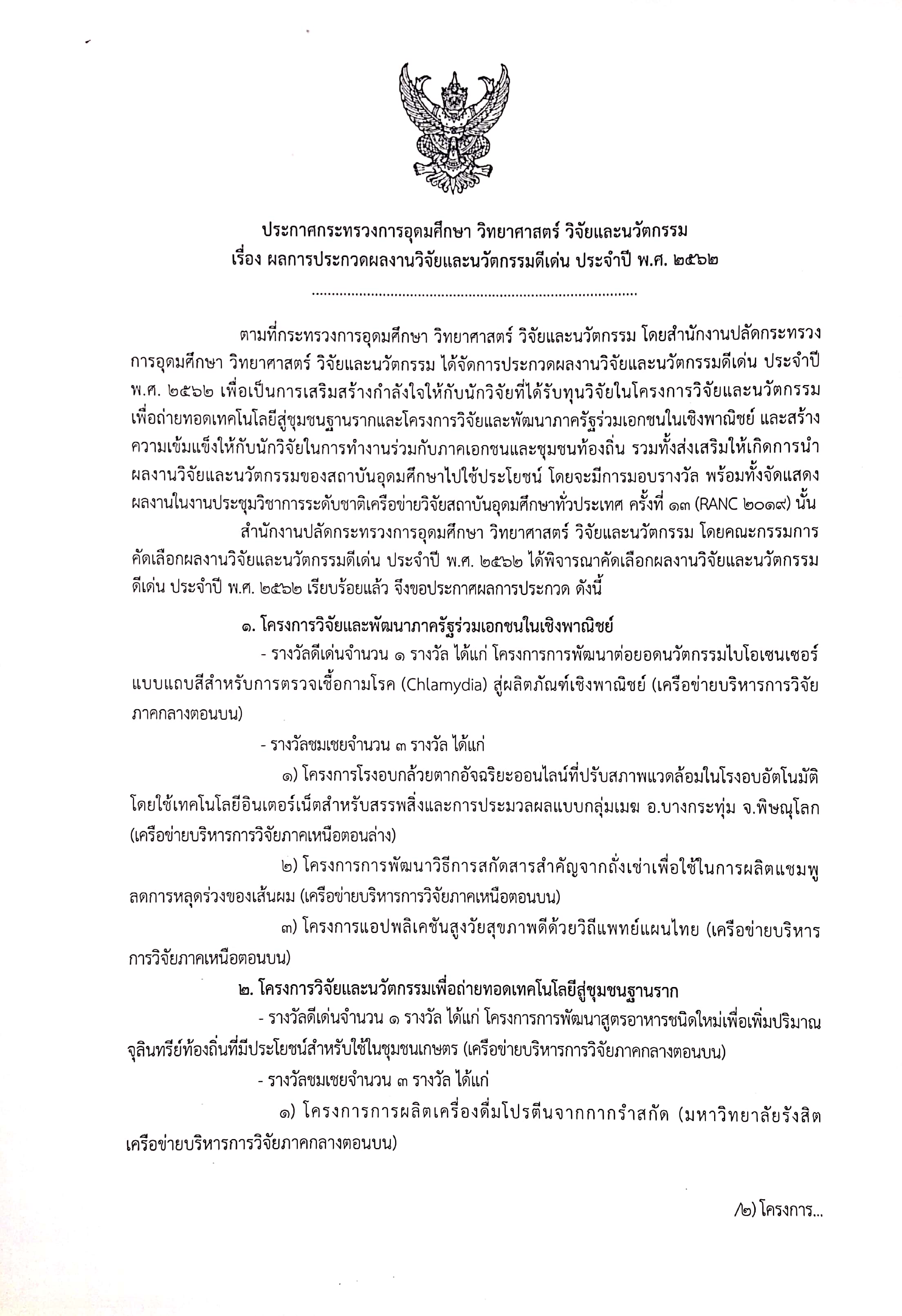 ประกาศเรื่อง...ผลการประกวดผลงานวิจัยและนวัตกรรมดีเด่น ประจำปี พ.ศ.๒๕๖๒