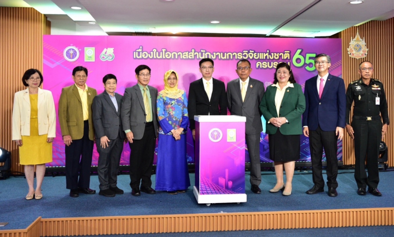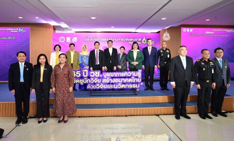 ศ.ดร.ศุภชัย ปทุมนากุล ปลัดกระทรวงการอุดมศึกษา วิทยาศาสตร์ วิจัยและนวัตกรรม กล่าวว่า กระทรวง อว. มีนโยบายในการขับเคลื่อนและยกระดับการพัฒนาทั้งด้านการอุดมศึกษา ด้านวิทยาศาสตร์ และด้านวิจัยและนวัตกรรม โดยในด้านวิจัยและนวัตกรรมได้มีกองทุนส่งเสริมวิทยาศาสตร์ วิจัยและนวัตกรรมเพื่อดูแลในการจัดสรรงบประมาณการวิจัยและนวัตกรรมให้กับประเทศ ซึ่งสำนักงานการวิจัยแห่งชาติ เป็นหนึ่งในหน่วยงานที่เป็นกำลังสำคัญในการขับเคลื่อนการทำงานด้านการวิจัยและนวัตกรรมมาอย่างต่อเนื่องหลายทศวรรษ รวมถึงได้มีบทบาทสำคัญในการพัฒนาขีดความสามารถในการวิจัยของประเทศให้สูงขึ้น สร้างฐานความรู้ที่มีคุณค่าสามารถประยุกต์และพัฒนาวิทยาการที่เหมาะสม รวมทั้งต่อยอดภูมิปัญญาท้องถิ่นให้เกิดประโยชน์ ทั้งในเชิงพาณิชย์ สังคม และสาธารณะ โดยใช้ทรัพยากรเครือข่ายวิจัยอย่างมีประสิทธิภาพ มีการผนึกกำลังการทำงานร่วมกับหลายภาคส่วน รวมทั้งมีนโยบายสนับสนุนและส่งเสริมการผลิตนักวิจัยที่ดีมีคุณภาพ และที่สำคัญคือการกำหนดแนวทางการวิจัยที่สอดคล้องกับการพัฒนาประเทศ จึงนับได้ว่า วช. เป็นอีกหนึ่งแรงสำคัญในการช่วยสนับสนุนการขับเคลื่อนนโยบายในการดำเนินงานของกระทรวง อว. ร่วมกับการทำงานกับภาคีเครือข่ายทั้งภายในกระทรวง อว. และภายนอกกระทรวงในโอกาสที่สำนักงานการวิจัยแห่งชาติ ได้สถาปนามาครบรอบ 65 ปี ในปีนี้ ขอขอบคุณคณะผู้บริหาร ข้าราชการ พนักงาน และ เจ้าหน้าที่ของ วช. ทุกท่านที่มุ่งมั่น ตั้งใจปฏิบัติหน้าที่อย่างเข้มแข็ง ในการพัฒนางานด้านการวิจัยและนวัตกรรมของประเทศให้มีความก้าวหน้า และเชื่อมั่นเป็นอย่างยิ่งว่า วช. จะเป็นกำลังสำคัญในการขับเคลื่อน อว. เพื่อสร้างอนาคตของประเทศ และยกระดับคุณภาพชีวิตของประชาชนให้ดีขึ้นได้ ต่อไป