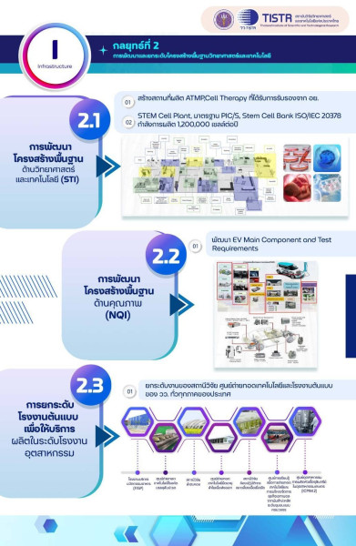 กลยุทธที่ 2 I : Infrastructure การพัฒนาและยกระดับโครงสร้างพื้นฐานวิทยาศาสตร์และเทคโนโลยี ดังนี้ 1.การพัฒนาโครงสร้างพื้นฐานวิทยาศาสตร์และเทคโนโลยี (STI) ได้แก่ สถานที่ผลิตยาหมวดชีววัตถุ (ATMPs, Cell Therapy) ที่ได้รับการรับรองจาก อย. และ Stem Cell Plant มาตรฐาน PIC/S GMP ,Stem Cell Bank ISO IEC 20378 กำลังผลิต 1,200,000 เซลล์/ปี โดยจะสร้างเสร็จในปี 2568 ใช้ระบบบริหารจัดการโดย Contract Development and Manufacturing Organization (CDMO) 2.การพัฒนาโครงสร้างพื้นฐานด้านคุณภาพ (NQI) เพื่อรองรับอุตสาหกรรม EV ทั้งการทดสอบ (Testing) และการตรวจสอบ (Inspection) และ 3.การยกระดับโรงงานต้นแบบ เพื่อให้บริการทดลองผลิตในระดับโรงงานอุตสาหกรรม