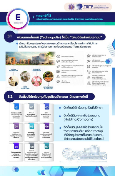 กลยุทธ์ที่ 3 E : Ecosystem เสริมสร้างผู้ประกอบการและอุตสาหกรรม ด้วยวิจัย วิทยาศาสตร์ เทคโนโลยีและนวัตกรรม ได้แก่ 1.พัฒนาเทคโนธานีให้เป็น “นิคมวิจัยสำหรับเอกชน” และ 2. จัดตั้งบริษัทร่วมทุนกับธุรกิจนวัตกรรม เพื่อนำผลงานวิจัยและนวัตกรรมไปใช้ประโยชน์ ทั้งเชิงพาณิชย์ สังคมและสาธารณประโยชน์