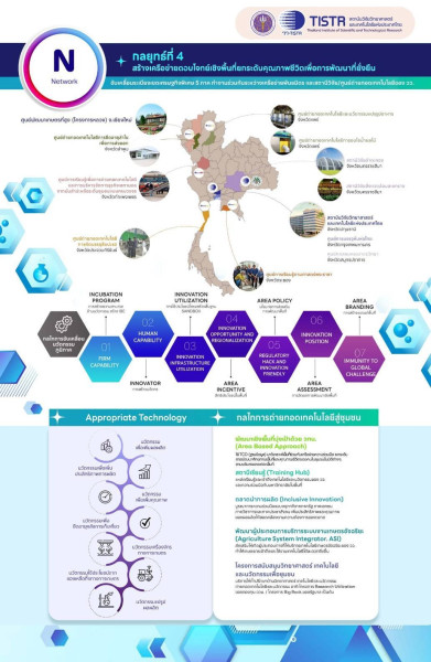 กลยุทธ์ที่ 4 N : Network สร้างเครือข่ายตอบโจทย์เชิงพื้นที่ ยกระดับคุณภาพชีวิต เพื่อการพัฒนาที่ยั่งยืน โดยครอบคลุม 1.การขับเคลื่อนเศรษฐกิจฐานราก และ 2.การพัฒนาเชิงพื้นที่ โดยการขับเคลื่อนระเบียงเศรษฐกิจพิเศษ 5 ภาค ผ่านความเชี่ยวชาญของเครือข่ายพันธมิตรและ วว.