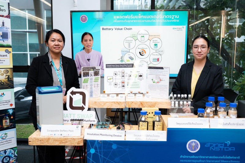 ด้านนวัตกรรมห่วงโซ่คุณค่าของแบตเตอรี่: ตอบโจทย์การเติบโตของอุตสาหกรรมยานยนต์ไฟฟ้า (EV) และระบบกักเก็บพลังงานอัจฉริยะ ที่ทำให้ใช้พลังงานได้อย่างเสถียร โดย ENTEC มีความเชี่ยวชาญในการพัฒนาแบตเตอรี่แบบครบวงจร ทั้งกระบวนการรีไซเคิล และเป็นส่วนสำคัญในการผลักดัน "Thailand BattSwap" ภายใต้ Thailand Standard Swappable Battery Consortium เพื่อสร้างมาตรฐานกลางของแบตเตอรี่แบบสับเปลี่ยนได้สำหรับ EV ขนาดเล็กทั่วประเทศ นอกจากนี้ยังเป็นส่วนหนึ่งของสมาคมเทคโนโลยีระบบกักเก็บพลังงานไทย (TESTA) และได้ริเริ่มพัฒนาแบตเตอรี่รุ่นใหม่ที่มีความจุสูง อายุการใช้งานยาวนาน และปลอดภัยสูง โดยใช้วัตถุดิบในประเทศ เพื่อลดการพึ่งพาการนำเข้าและสร้างความมั่นคงทางพลังงาน
