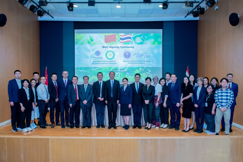 (วันที่ 30 พฤษภาคม 2568) ที่ห้องออดิทอเรียม อาคารไบโอเทค อุทยานวิทยาศาสตร์ประเทศไทย จ.ปทุมธานี : สำนักงานพัฒนาวิทยาศาสตร์และเทคโนโลยีแห่งชาติ (สวทช.) โดยศูนย์พันธุวิศวกรรมและเทคโนโลยีชีวภาพแห่งชาติ (BIOTEC) และ สถาบันวิจัยพฤกษศาสตร์คุนหมิง (Kunming Institute of Botany: KIB) สถาบันวิจัยด้านพฤกษศาสตร์ชั้นนำของสาธารณรัฐประชาชนจีน ภายใต้สถาบันบัณฑิตวิทยาศาสตร์จีน (Chinese Academy of Sciences: CAS) ลงนามความร่วมมือด้านการวิจัยทางการเกษตรและเทคโนโลยีชีวภาพ การผนึกกำลังครั้งนี้มีเป้าหมายเพื่อนำจุดเด่นของแต่ละหน่วยงานมาร่วมกันสร้างองค์ความรู้และงานวิจัยด้านการอนุรักษ์และใช้ประโยชน์ความหลากหลายทางชีวภาพอย่างยั่งยืนของจีนและภูมิภาคเอเชียตะวันออกเฉียงใต้ โดยมีนายหม่า มิงเกิง ที่ปรึกษาด้านวิทยาศาสตร์และเทคโนโลยี สถานเอกอัครราชทูตสาธารณรัฐประชาชนจีนประจำประเทศไทย ร่วมแสดงความยินดี พร้อมด้วยผู้บริหาร และนักวิจัยจากทั้งสองหน่วยงานร่วมในงาน