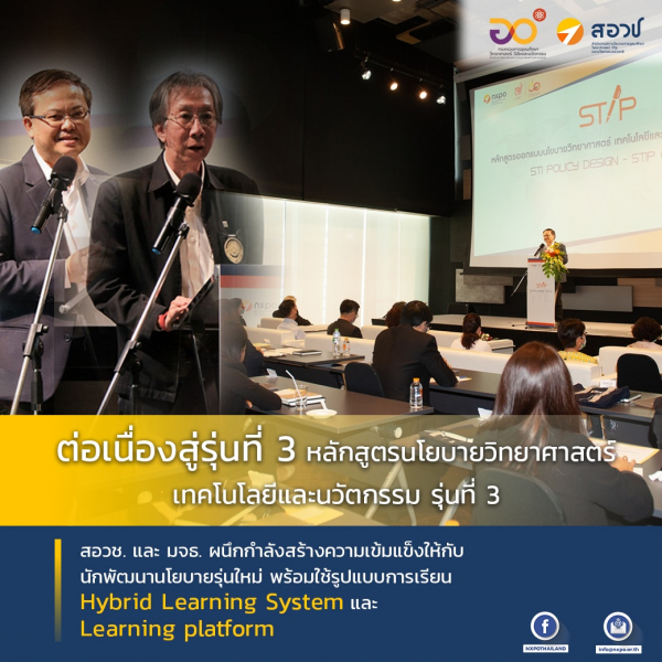 เมื่อวันที่ 1 กุมภาพันธ์ 2564 สำนักงานสภานโยบายการอุดมศึกษา วิทยาศาสตร์ วิจัยและนวัตกรรมแห่งชาติ (สอวช.) ร่วมกับ สถาบันนโยบายวิทยาศาสตร์ เทคโนโลยีและนวัตกรรม (STIPI) มหาวิทยาลัยเทคโนโลยีพระจอมเกล้าธนบุรี (มจธ.) จัดพิธีเปิดหลักสูตรนโยบายวิทยาศาสตร์ เทคโนโลยีและนวัตกรรม รุ่นที่ 3 (STIP03) ณ อาคาร KX มจธ. โดยมีเนื้อหาหลักสูตรที่เน้นถึงการสนับสนุนการพัฒนาศักยภาพของบุคลากรให้มีความรู้และความสามารถในการออกแบบและจัดทำนโยบายด้านการอุดมศึกษา วิทยาศาสตร์ วิจัยและนวัตกรรม (อววน.) รวมถึงการสร้างเครือข่ายของนักพัฒนานโยบาย อววน. ซึ่งได้รับเกียรติจาก ดร.กิติพงค์ พร้อมวงค์ ผู้อำนวยการ สอวช. และรองศาสตราจารย์ ดร.สุวิทย์ แซ่เตีย อธิการบดีมหาวิทยาลัยเทคโนโลยีพระจอมเกล้าธนบุรี กล่าวต้อนรับและเปิดงานในครั้งนี้