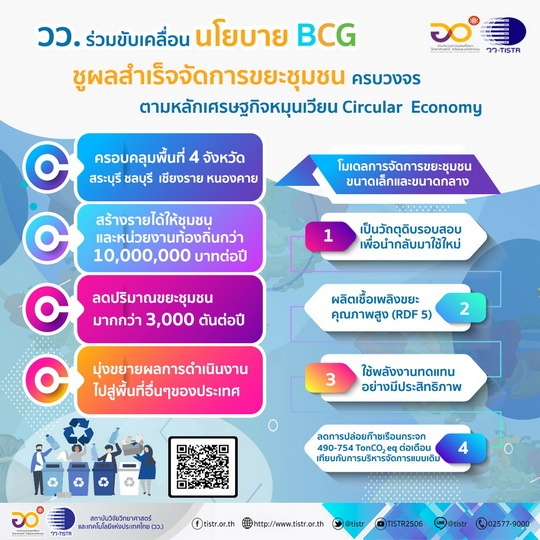กระทรวงการอุดมศึกษา วิทยาศาสตร์ วิจัยและนวัตกรรม (อว.) โดย สถาบันวิจัยวิทยาศาสตร์และเทคโนโลยีแห่งประเทศไทย (วว.) ร่วมขับเคลื่อนนโยบาย BCG สนับสนุน ส่งเสริม สร้างเศรษฐกิจเข้มแข็ง สังคมยั่งยืน ด้วยวิทยาศาสตร์ เทคโนโลยีและนวัตกรรมเป็นรูปธรรม ชูผลสำเร็จการจัดการขยะชุมชนครบวงจรและสร้างมูลค่าเพิ่มจากขยะเพื่อนำกลับมาใช้ใหม่ ตามหลักเศรษฐกิจหมุนเวียน (Circular Economy) ครอบคลุมพื้นที่ 4 ภูมิภาคของไทย ได้แก่ จังหวัดสระบุรี ชลบุรี เชียงราย และหนองคาย โดยขยายผลความสำเร็จจากโครงการแก้ไขปัญหาสิ่งแวดล้อมและขยะพลาสติกในชุมชนเพื่อการบูรณาการอย่างยั่งยืน ตำบลตาลเดี่ยว อำเภอแก่งคอย จังหวัดสระบุรี “ตาลเดี่ยวโมเดล” สามารถสร้างรายได้ให้หน่วยงานท้องถิ่นกว่า 10,000,000 บาทต่อปี พร้อมมุ่งขยายผลการดำเนินงานไปสู่พื้นที่อื่นๆของประเทศต่อไป