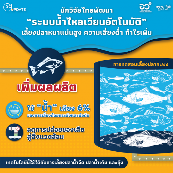 กระทรวงการอุดมศึกษา วิทยาศาสตร์ วิจัยและนวัตกรรม โดยศูนย์เทคโนโลยีโลหะและวัสดุแห่งชาติ (เอ็มเทค) สำนักงานพัฒนาวิทยาศาสตร์และเทคโนโลยีแห่งชาติ (สวทช.) วิจัยเทคโนโลยีต้นแบบ “ระบบอัตโนมัติสำหรับเพาะเลี้ยงปลากะพงในระบบน้ำไหลเวียน” ซึ่งพัฒนาจากระบบการเลี้ยงแบบน้ำไหลเวียน (Recirculation Aquaculture System: RAS) เทคโนโลยีเพื่อการทำประมงอย่างยั่งยืนที่กำลังได้รับความนิยมจากฝั่งตะวันตก เป็นเทคโนโลยีที่มีการพึ่งพิงทรัพยากรธรรมชาติน้อย ให้ผลผลิตสูง ความเสี่ยงต่ำ เป็นมิตรต่อสิ่งแวดล้อม และเป็นรูปแบบการทำประมงที่ถูกกฎหมาย
