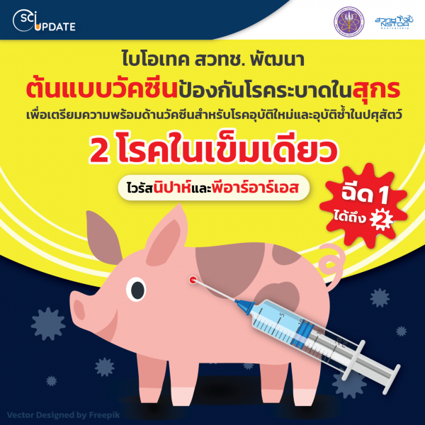 แม้ในตอนนี้จะยังไม่พบการอุบัติซ้ำที่รุนแรง แต่หากไม่มีการเฝ้าระวังและเตรียมการป้องกันโรคไว้ล่วงหน้า เมื่อเกิดเหตุขึ้นอีกครั้งก็อาจสร้างความเสียหายได้ไม่น้อยกว่าเหตุการณ์ที่เคยเผชิญกันมาแล้ว กระทรวงการอุดมศึกษา วิทยาศาสตร์ วิจัยและนวัตกรรม (อว.) โดยศูนย์พันธุวิศวกรรมและเทคโนโลยีชีวภาพแห่งชาติ (ไบโอเทค) สำนักงานพัฒนาวิทยาศาสตร์และเทคโนโลยีแห่งชาติ (สวทช.) วิจัยพัฒนา “วัคซีนต้นแบบสำหรับป้องกันการติดเชื้อไวรัสนิปาห์และไวรัสพีอาร์อาร์เอส (PRRS) ในสุกร” ที่คาดหวังว่าจะสามารถป้องกันโรคอันตรายได้ถึง 2 ชนิด ในวัคซีนเข็มเดียว