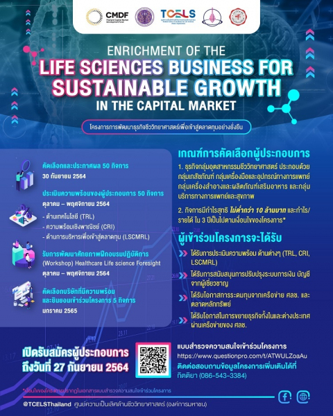 ขอเชิญชวนผู้ประกอบการธุรกิจกลุ่มอุตสาหกรรมชีววิทยาศาสตร์เข้าร่วมสมัคร “โครงการการพัฒนาธุรกิจชีววิทยาศาสตร์เพื่อเข้าสู่ตลาดทุนอย่างยั่งยืน” เพื่อยกระดับและพัฒนาศักยภาพกลุ่มอุตสาหกรรมชีววิทยาศาสตร์ ซึ่งเป็นกลไกในการขับเคลื่อนระบบเศรษฐกิจและสังคมของประเทศ สู่การดำเนินธุรกิจอย่างยั่งยืน