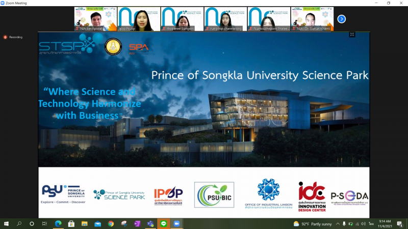 โดยได้รับเกียรติจาก ผศ.ดร.รัญชนา สินธวาลัย ผู้ช่วยผู้อำนวยการอุทยานวิทยาศาสตร์ภาคใต้ มหาวิทยาลัยสงขลานครินทร์ เป็นประธานกล่าวเปิดกิจกรรม และต้อนรับผู้เข้าร่วมสัมมนาออนไลน์ โดยกิจกรรมประกอบด้วยการแนะนำบริการอุทยานวิทยาศาสตร์ มหาวิทยาลัยสงขลานครินทร์ การให้ความรู้เกี่ยวกับนวัตกรรม การสนับสนุนและส่งเสริมผู้ประกอบการผ่านกลไกการให้ทุนสำหรับทำต้นแบบนวัตกรรมของทุน Open innovation การเตรียมข้อมูลสำหรับการ Pitching Concept Idea การเขียนข้อเสนอโครงการ และตัวอย่างโครงการนวัตกรรมที่ได้รับการสนับสนุน ซึ่งในกิจกรรมมีผู้ประกอบการ คณาจารย์ และหน่วยงานทั้งภาครัฐและภาคเอกชนในพื้นที่ เข้าร่วมมากกว่า 35 ราย รวมทั้งมีผู้ประกอบการเข้าร่วม Pitching concept idea จำนวน 10 ราย