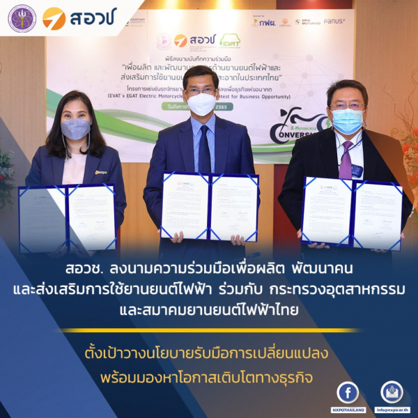 สำนักงานสภานโยบายการอุดมศึกษา วิทยาศาสตร์ วิจัยและนวัตกรรมแห่งชาติ (สอวช.) ร่วมลงนามบันทึกความร่วมมือเพื่อผลิต และพัฒนาบุคลากรด้านยานยนต์ไฟฟ้าและส่งเสริมการใช้ยานยนต์พลังงานสะอาดในประเทศไทย โครงการแข่งขันรถจักรยานยนต์ไฟฟ้าดัดแปลงเพื่อธุรกิจแห่งอนาคต (EVAT x EGAT Electric Motorcycle Conversion Contest for Business Opportunity) ร่วมกับกระทรวงอุตสาหกรรม และสมาคมยานยนต์ไฟฟ้าไทย เมื่อวันที่ 18 มกราคม 2565 ที่ผ่านมา ณ ห้องประชุม 5 ชั้น 1 อาคารสำนักงานคณะกรรมการการอาชีวศึกษา กระทรวงศึกษาธิการ