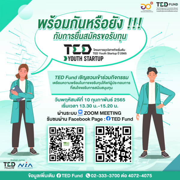 กองทุนพัฒนาผู้ประกอบการเทคโนโลยีและนวัตกรรม (TED Fund) ขอเชิญ ผู้ประกอบการที่สนใจขอรับการสนับสนุนทุนจากโครงการยุววิสาหกิจเริ่มต้น (TED Youth Startup) ปี 2565 ร่วมรับฟังการบรรยาย ระบบลงทะเบียน ขั้นตอน วิธีการและเกณฑ์การสมัครต่างๆ ของโครงการฯ ผ่านระบบ ZOOM MEETING รับชมผ่าน Facebook Page : TED Fund วันนี้พบกัน  ตั้งแต่เวลา 13.30 เป็นต้นไป