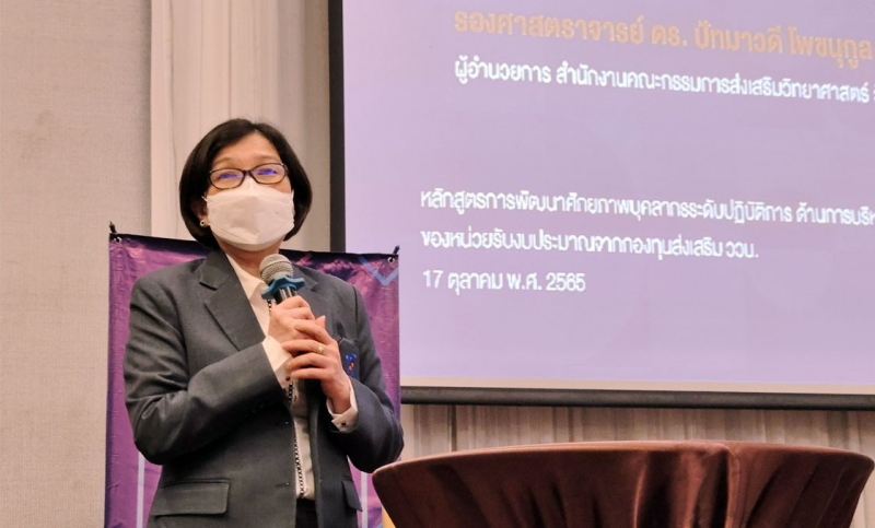 17 ตุลาคม 2565 ณ โรงแรมเซ็นจูรี่ พาร์ค กรุงเทพฯ รองศาสตราจารย์ ดร.ปัทมาวดี โพชนุกูล ผู้อำนวยการสำนักงานคณะกรรมการส่งเสริมวิทยาศาสตร์ วิจัยและนวัตกรรม (สกสว.) เป็นประธานเปิดการอบรมหลักสูตรการพัฒนาศักยภาพบุคลากรระดับปฏิบัติการด้านการบริหารจัดการงานวิจัยและนวัตกรรม ของหน่วยรับงบประมาณจากกองทุนส่งเสริมวิทยาศาสตร์ วิจัยและนวัตกรรม (ววน.) รุ่นที่ 1 ซึ่งจัดโดยสำนักพัฒนาระบบ ววน. ด้านการส่งเสริมความเข้มแข็งของหน่วยงานในระบบ ววน. สกสว. ร่วมกับมหาวิทยาลัยพะเยา โดยมี ศาสตราจารย์ ดร.เสมอ ถาน้อย รองอธิการบดีฝ่ายวิจัยและนวัตกรรม มหาวิทยาลัยพะเยา เป็นผู้บริหารหลักสูตร