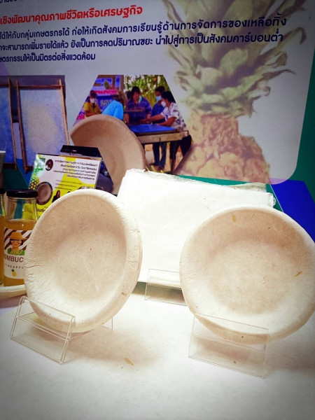 สำหรับวัสดุเหลือทิ้งทางการเกษตร ได้แก่ เปลือกมะพร้าว ชานอ้อย ฟางข้าว ทางทีมวิจัยได้มีการนำองค์ความรู้ทางเทคโนโลยี มาพัฒนาประยุกต์ผลิตกระดาษจากใยสับปะรด ซึ่งพบว่ากระดาษสับปะรดมีคุณสมบัติพิเศษคือมีความนุ่มเหนียว และทำได้บางกว่ากระดาษจากใยพืชชนิดอื่น ๆ สามารถนำไปประยุกต์ใช้กับงานคราฟต์ และงานหัตถกรรมได้ดี และเมื่อนำไปอัดด้วยความร้อนจะได้เป็นภาชนะและบรรจุภัณฑ์ที่ย่อยสลายได้ เป็นมิตรต่อสิ่งแวดล้อม