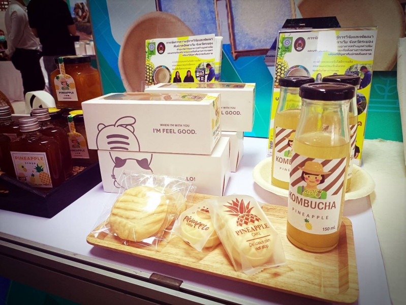 ขณะเดียวกันเพื่อการใช้ประโยชน์อย่างคุ้มค่าตามแนวคิด zero-waste หรือ “ของเสียเหลือศูนย์” ทีมวิจัยยังได้นำวัตถุดิบที่เหลือจากกระบวนการทำไซรัป มาต่อยอดแปรรูปเป็นแยมสับปะรด และคุกกี้ไฟเบอร์สับปะรด เพื่อเพิ่มมูลค่าให้กับ food waste โดยเฉพาะแกนสับปะรดที่ปกติชาวบ้านจะทิ้งไปในกระบวนการแปรรูปนี้มีเอนไซม์โบรมีเลน ซึ่งมีสมบัติช่วยย่อยอาหาร เพิ่มภูมิต้านทานให้กับร่างกาย ซึ่งผลิตภัณฑ์ชุมชนเหล่านี้ใช้วัตถุดิบธรรมชาติล้วน และไม่ใส่วัตถุกันเสีย นอกจากนี้ทีมวิจัยยังนำน้ำสับปะรดมาพัฒนาเป็นเครื่องดื่ม “คอมบูชา” ที่มีจุลินทรีย์โพรไบโอติกส์ มีส่วนช่วยรักษาสมดุลของระบบทางเดินอาหารและระบบขับถ่าย เป็นเครื่องดื่มสุขภาพที่กำลังอยู่ในกระแสนิยมของผู้บริโภคปัจจุบัน สร้างความหลากหลายให้กับผลิตภัณฑ์ชุมชน